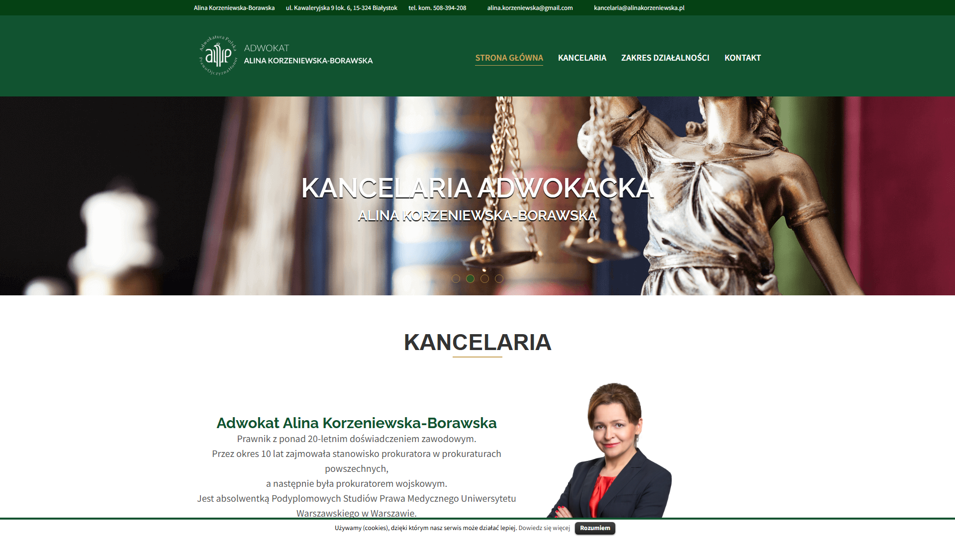 https://alinakorzeniewska.pl/Szukasz rzetelnej pomocy prawnej w sercu Podlasia? Kancelaria Adwokacka “Lex Białystok” to Twój partner w każdej sprawie: od odszkodowań komunikacyjnych i medycznych, przez prawo rodzinne i spadkowe, aż po prawo gospodarcze i handlowe. Nasz zespół adwokatów wpisanych na listę Okręgowej Rady Adwokackiej w Białymstoku łączy wiedzę z zakresu: • Prawo cywilne (Kodeks cywilny, roszczenia, eksmisje) • Prawo karne (obrona w sprawach karnych, postępowanie przygotowawcze, apelacje do Sądu Okręgowego i Sądu Najwyższego) • Prawo rodzinne i opiekuńcze (rozwody, alimenty, ustalenie opieki nad dziećmi) • Prawo pracy i ubezpieczeń społecznych (umowy o pracę, mobbing, świadczenia ZUS) • Prawo spółek handlowych (rejestracja w KRS, fuzje, przekształcenia, Kodeks spółek handlowych) • Prawo nieruchomości i budowlane (umowy deweloperskie, spory graniczne, pozwolenia na budowę) • RODO i ochrona danych osobowych (GIODO, UODO, audyty zgodności) Dlaczego my? – Ponad 15 lat doświadczenia w sądach rejonowych, okręgowych i wojewódzkich. – Skuteczne negocjacje i sprawdzone strategie procesowe. – Bezpłatna wstępna konsultacja w siedzibie przy ul. Lipowej 12, Białystok lub online. – Indywidualne podejście poparte najnowszymi wyrokami Trybunału Sprawiedliwości UE i Europejskiego Trybunału Praw Człowieka. – Elastyczne formy rozliczeń: ryczałt, stawka godzinowa, success fee. Zaufaj opiniom Klientów z Google i Panoramy Firm – dołącz do grona zadowolonych osób, które odzyskały spokój i bezpieczeństwo prawne. Skontaktuj się z nami już dziś: Tel. +48 85 123 45 67 | e-mail: [email protected] Kancelaria Adwokacka “Lex Białystok” – Twój adwokat w Białymstoku i na Podlasiu!
