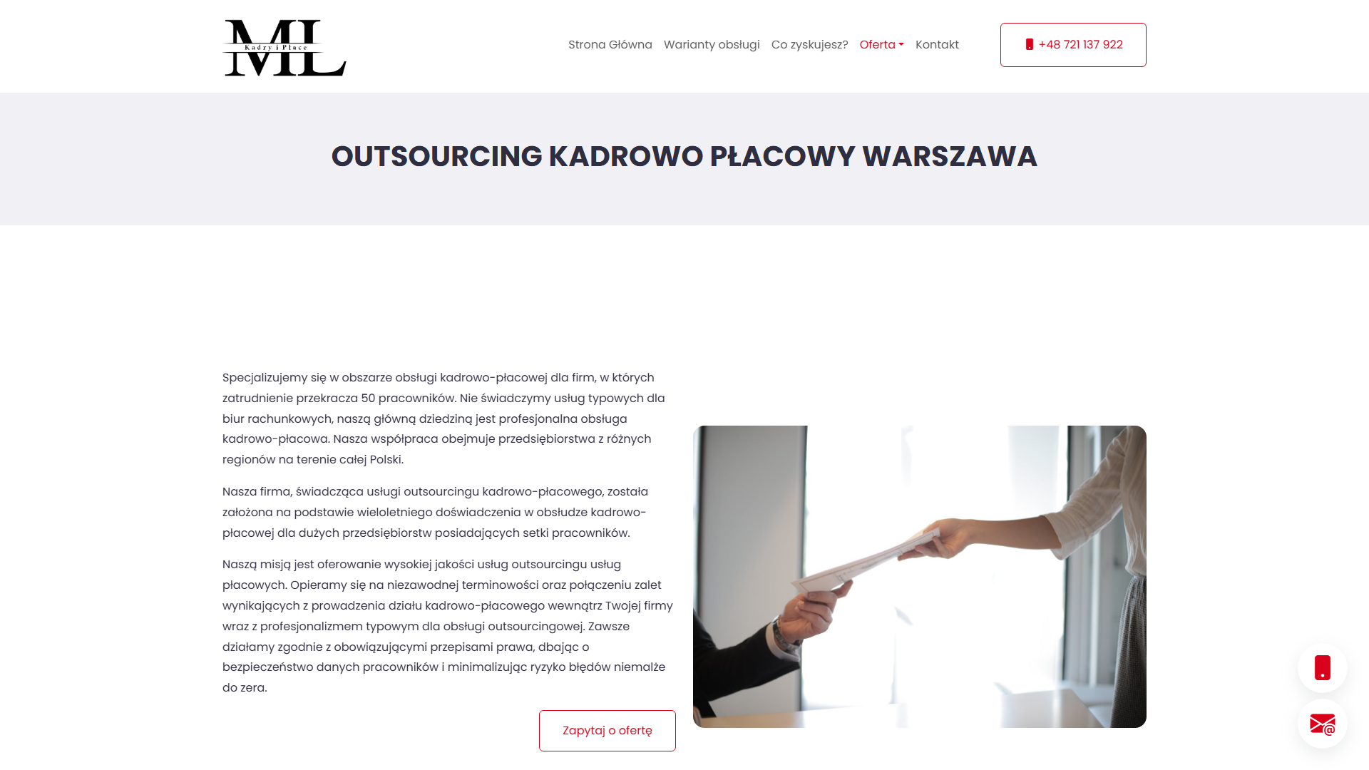 https://mlkadry.net/outsourcing-kadrowo-placowy-warszawa/Outsourcing Kadrowo-Płacowy Warszawa – Kompleksowa Obsługa Kadrowa i Płacowa dla Twojej Firmy Szukasz sprawdzonego partnera HR w Warszawie? Nasze usługi outsourcingu kadrowo-płacowego to: • Pełna obsługa kadrowa (umowy o pracę, umowy zlecenia, B2B, ewidencja czasu pracy, akta osobowe) • Profesjonalne naliczanie wynagrodzeń brutto/netto, dodatków, premii, nadgodzin • Generowanie i wysyłka e-deklaracji ZUS DRA, RCA, PIT-11, PFRON, e-PUAP • Zarządzanie dokumentacją pracowniczą zgodnie z RODO, Kodeksem Pracy, BHP • Elektroniczny obieg dokumentów (e-HR, e-archiwum, portal pracowniczy) • Raporty i analizy HR / BI (turnover, absencje, koszty personalne) • Audyt kadrowy, compliance, wsparcie w kontrolach ZUS i PIP Dlaczego warto wybrać nasz outsourcing kadrowo-płacowy w Warszawie? • Optymalizacja kosztów i zasobów – skup się na rozwoju biznesu • Zespół certyfikowanych specjalistów HR i ekspertów od prawa pracy • Nowoczesne oprogramowanie kadrowo-płacowe i automatyzacja procesów • Elastyczne podejście – obsługujemy mikroprzedsiębiorstwa, średnie firmy i korporacje • Natychmiastowa aktualizacja przepisów podatkowych i ZUS Zaufaj ekspertom od outsourcingu kadrowo-płacowego w Warszawie. Skontaktuj się z nami już dziś, aby otrzymać darmową wycenę i przyspieszyć procesy kadrowe w Twojej firmie!