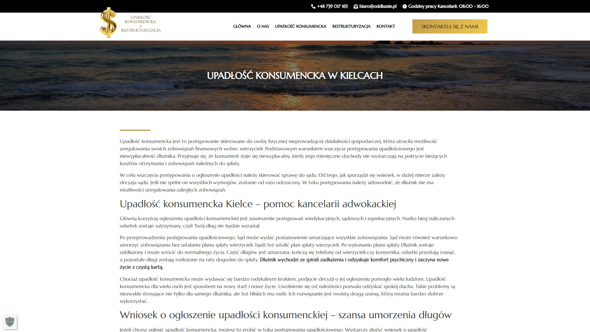 https://oddluzsie.pl/upadlosc-konsumencka-kielce/Upadłość Konsumencka Kielce – Odetchnij z ulgą już dziś! Zmagasz się z zadłużeniem w Biurze Informacji Kredytowej (BIK), Krajowym Rejestrze Dłużników (KRD) lub z wezwaniami Komornika Sądowego przy Sądzie Rejonowym w Kielcach? Nasza Kancelaria Radcy Prawnego w województwie świętokrzyskim pomaga w pełnej procedurze upadłości konsumenckiej (ustawa Prawo upadłościowe, Dz.U. 2015 poz. 233). Współpracujemy z profesjonalnymi doradcami restrukturyzacyjnymi wpisanymi do ewidencji Ministerstwa Sprawiedliwości, aby: • ZATRZYMAĆ egzekucję Komornika – ochrona przed zajęciami rachunków bankowych i wynagrodzenia • UZYSKAĆ umorzenie części lub całości zobowiązań – plan spłaty nawet do 36 miesięcy • ZŁOŻYĆ wniosek przez system eKRS – pełna obsługa formalna w Sądzie Rejonowym w Kielcach, Oddział w Kielcach • CHRONIĆ majątek niepodlegający egzekucji (lokal mieszkalny, wyposażenie RTV/AGD, przedmioty codziennego użytku) • KORZYSTAĆ z darmowej analizy zdolności finansowej – indywidualny harmonogram spłat Dlaczego my? – Doświadczony zespół adwokatów i radców prawnych – Rejestracja w Krajowym Rejestrze Sądowym (KRS) – Bezpośrednia współpraca z doradcą restrukturyzacyjnym – Kompleksowe doradztwo (Prawo upadłościowe, Prawo restrukturyzacyjne, prawo cywilne) – Szczegółowa wiedza o postępowaniu przed Sadem Rejonowym w Kielcach Nie czekaj, aż działania windykacyjne zablokują Ci konto w banku lub zlicytują dorobek życia. Skorzystaj z profesjonalnej pomocy doradcy w Kielcach! Zadzwoń teraz: 123 456 789 Umów bezpłatną konsultację online lub w biurze przy ul. Sienkiewicza 45, Kielce www.upadlosckonsumenckakielce.pl