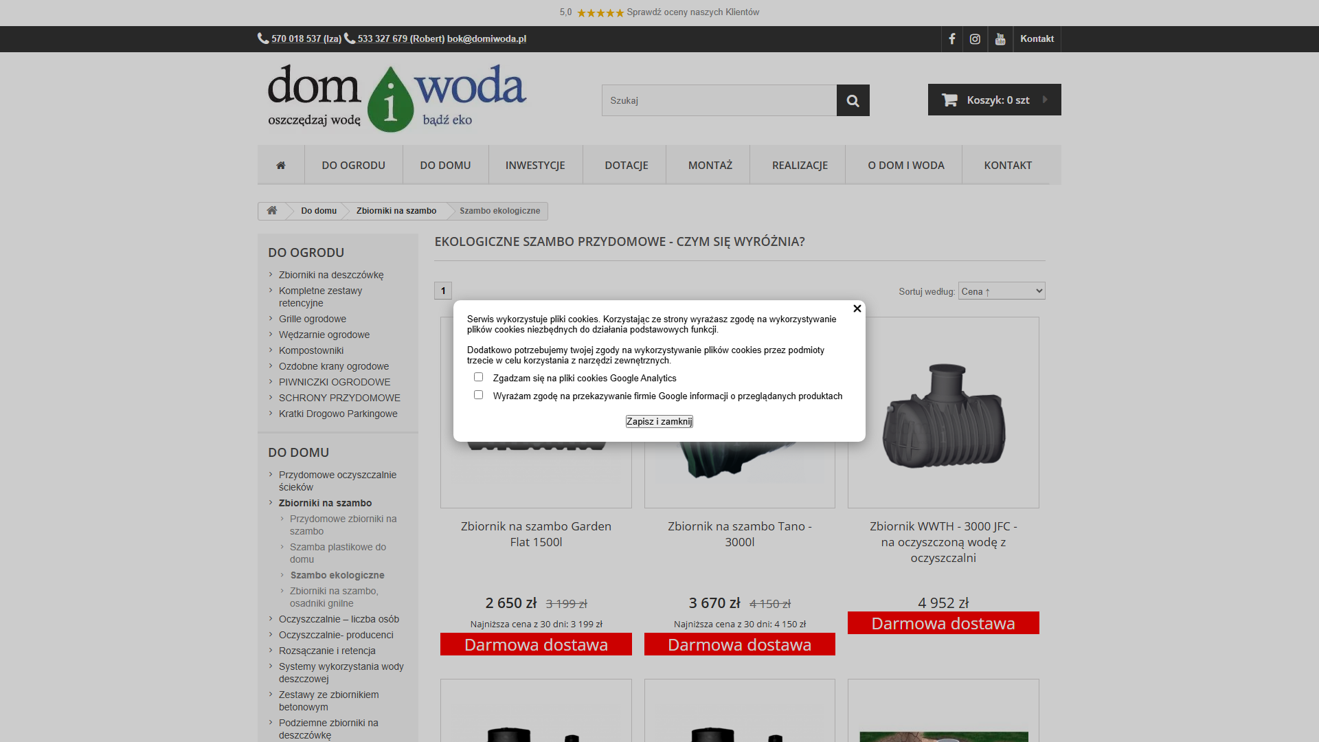 https://www.domiwoda.pl/k181,szambo-ekologiczne.htmlSzambo ekologiczne BioSet – Twoja przydomowa oczyszczalnia ścieków nowej generacji! Zainwestuj w system przydomowy zgodny z normą PN-EN 12566-1, certyfikowany CE i ETV, w którym: • Osadnik wstępny separuje zawiesiny, tłuszcze i piaski • Bioreaktor z złożem biocelulozowym zapewnia pełną eliminację związków organicznych (BZT, ChZT) • Filtr tlenowy z mediami drenarskimi (rura drenarska, złoże kamienne) gwarantuje klarowną odprowadzaną do gruntu wodę • Separator ropopochodny i filtr koalescencyjny chronią środowisko i wody gruntowe Dlaczego warto wybrać nasze ekologiczne szambo? – Bezodpływowe, szczelne zbiorniki z PEHD, PP lub żelbetu – Automatyczna przepompownia ścieków i system napowietrzania AZO – Niskie koszty eksploatacji – oszczędność energii i brak konieczności częstego opróżniania – Montaż w całej Polsce (Warszawa, Kraków, Wrocław, Poznań, Trójmiasto) w 24–48 h – Pakiet serwisowy 24/7, gwarancja 5 lat, wsparcie techniczne i doradztwo dotacyjne Skorzystaj z rządowych dofinansowań na przydomowe oczyszczalnie ścieków i zadbaj o ekologię swojej posesji. Zamów bezpłatny projekt i wycenę już dziś! Kliknij „ZAPYTAJ OFERTOWO” i zyskaj czystą wodę, komfort użytkowania i spokój ducha.