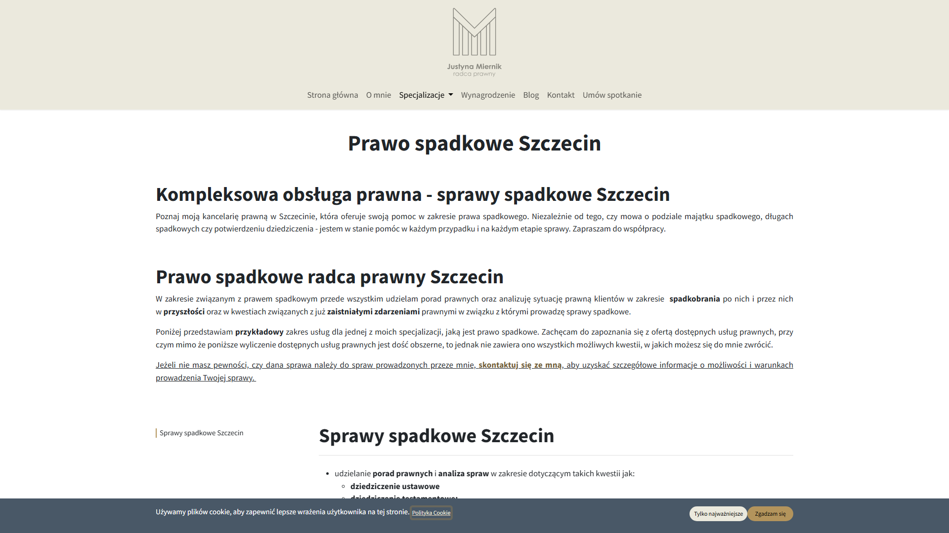 https://www.kancelariamiernik.pl/sprawy-spadkowe-szczecinPotrzebujesz wsparcia w sprawach dziedziczenia? Kancelaria Prawna Adwokat Jan Kowalski w Szczecinie to Twój partner w zakresie prawa spadkowego! Dlaczego warto nam zaufać? • Prawo spadkowe Szczecin – specjaliści od testamentów, zachowku, podziału majątku i odrzucenia spadku • Kompleksowa obsługa przed Sądami Rejonowymi Szczecin-Centrum i Szczecin-Prawobrzeże oraz przed Sądem Okręgowym w Szczecinie • Notarialne postępowania spadkowe: sporządzanie testamentów, protokoły dziedziczenia, akty poświadczenia dziedziczenia u notariusza • Europejski Certyfikat Spadkowy (ECS) wg Rozporządzenia (UE) nr 650/2012 – szybkie potwierdzenie praw spadkobierców w całej UE • Usługi genealogii spadkowej, sporządzanie wniosków o wpisy do ksiąg wieczystych, analiza masy spadkowej, sygnatury akt • Indywidualne podejście, pełna dyskrecja i doradztwo podatkowe (podatek od spadków i darowizn) Odwiedź nas przy Wałach Chrobrego 12 (blisko Urzędu Miasta Szczecin) lub zadzwoń: 91 123 45 67. Umów bezpłatną konsultację online – przekonaj się, jak prawa spadkowe w Szczecinie mogą działać na Twoją korzyść!