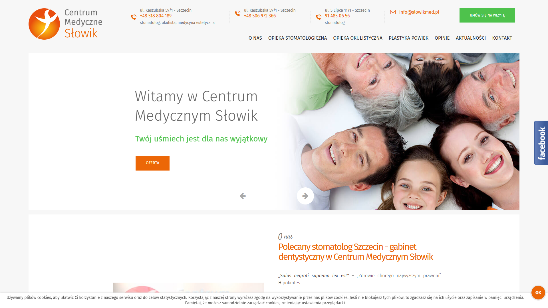 https://www.slowikmed.pl/DentalArt – Twój nowy dentysta w Szczecinie! Szczecin, Śródmieście, ul. Jana z Kolna 5 –––––––––––––––––––––––––––––––––––––––––––––––––––––––– Zadbaj o uśmiech z profesjonalistami z Gabinetu Stomatologicznego DentalArt – liderem w implantologii Nobel Biocare, protetyce CAD/CAM, ortodoncji Invisalign i leczeniu kanałowym pod mikroskopem. Nasza klinika, zlokalizowana przy Wałach Chrobrego, to renomowany punkt Polskiego Towarzystwa Stomatologicznego i członek Polskiej Izby Stomatologicznej, oferujący: • Implanty zębowe Straumann, Nobel z natychmiastowym obciążeniem • Korony porcelanowe Procera, licówki e.max, mosty cyrkonowe • Ortodoncja: aparaty stałe Damon, nakładki Invisalign i Clear Aligner • Endodoncja mikroskopowa, leczenie kanałowe MTA, reendo • Chirurgia stomatologiczna: ekstrakcje, podniesienie zatoki (sinus lift), implantacja chirurgiczna • Periodontologia: skaling, kiretaż, terapie płytkie i głębokie • Estetyka: profesjonalne wybielanie Beyond Polus, piaskowanie AirFlow, bonding kompozytowy • Diagnostyka 3D: RTG panoramiczne, tomografia CBCT, cyfrowe skanery wewnątrzustne i projektowanie CAD/CAM • Bezstresowe leczenie: znieczulenie komputerowe The Wand, sedacja wziewna podtlenkiem azotu • Pedodoncja: opieka nad dziećmi, lakowanie, fluoryzacja –––––––––––––––––––––––––––––––––––––––––––––––––––––––– Dlaczego DentalArt? • Certyfikowani specjaliści CM UAM, szkolenia u profesora Borisa Becker’a • Elastyczne terminy, wizyty online i weekendowe • Dogodny dojazd, parking, winda dla pacjentów niepełnosprawnych • Bezpłatny przegląd kontrolny i konsultacja implantologiczna Sprawdź opinie Google, skorzystaj z promocji na wybielanie i konsultacje ortodontyczne. Umów wizytę już dziś! Telefon: 91 123 45 67 • email: [email protected] • www.dentalart.pl